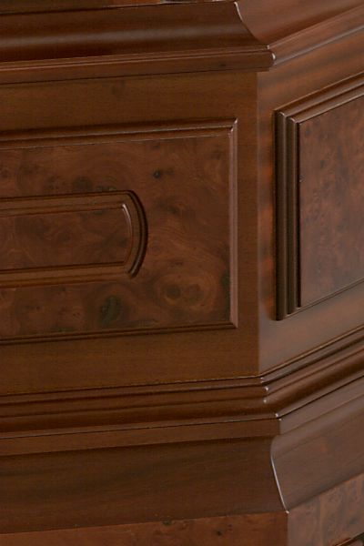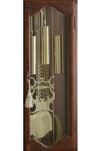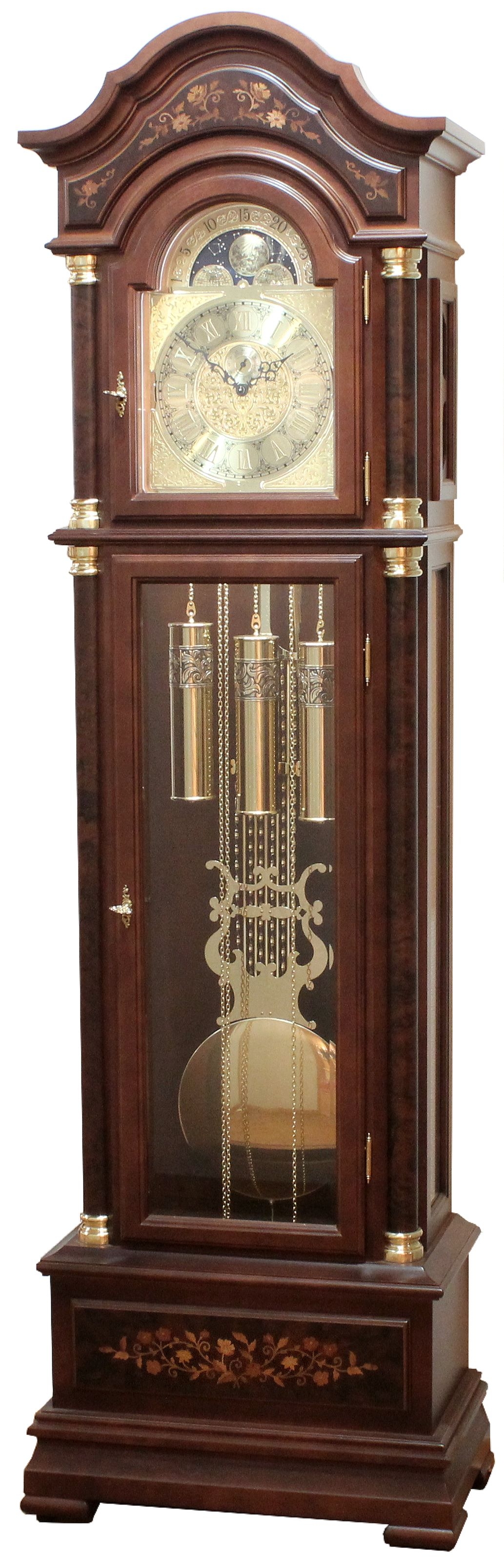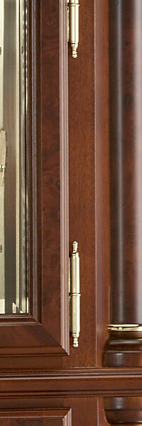 Edles Standuhrgehäuse mit Facetteverglasung und halbrunden Säulen und echten Intarsien Polierte massive Messingkapitelle an den Säulenenden. Die Seitentürchen am oberen Gehäuseteil lassen sich öffnen (abgebildet in Nussbaum-Wurzel). 8-Tage