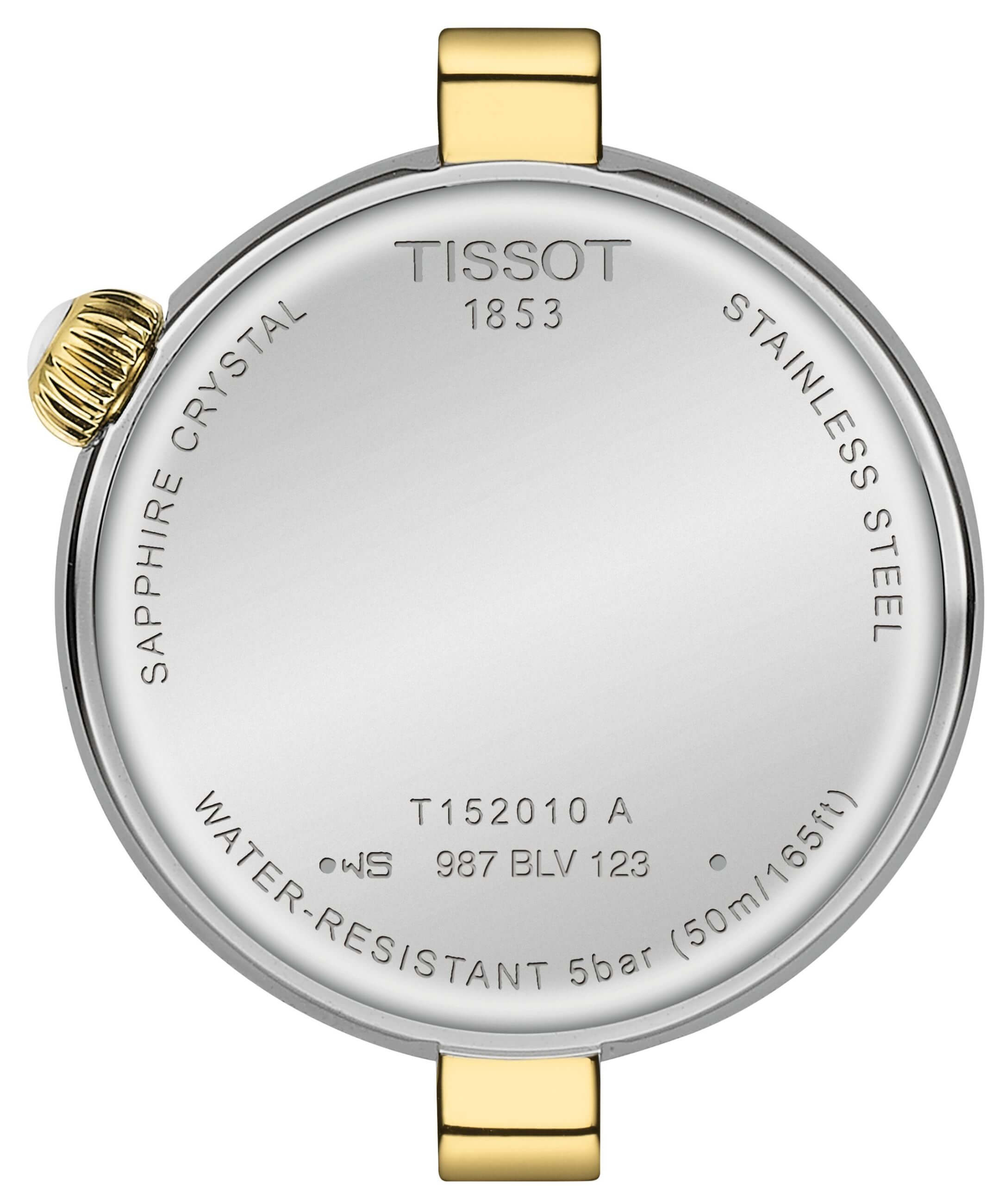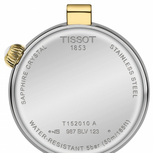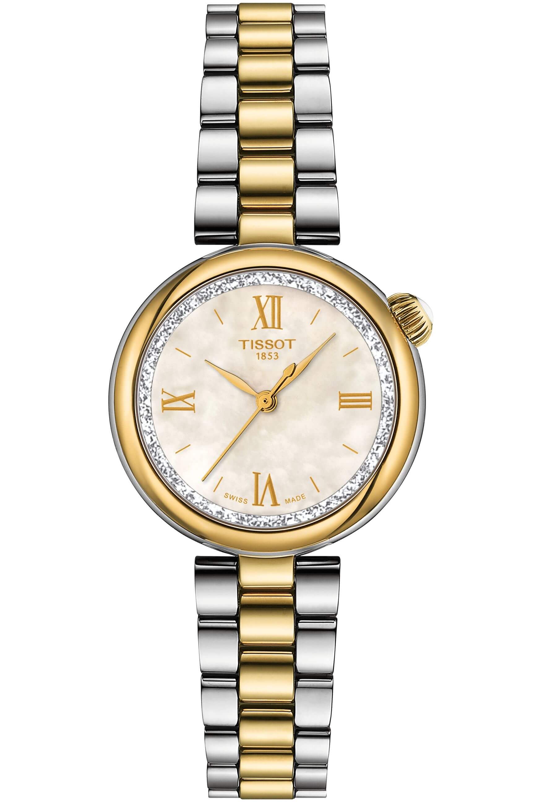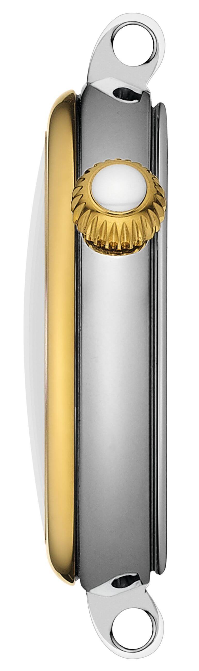 Diese Ausführung der Tissot Desir besitzt ein 28 mm messendes 316L-Edelstahlgehäuse in Bicolor mit gelbgoldfarbener PVD-Beschichtung. Ihr weißes Perlmuttzifferblatt verfügt über einen silberfarben glitzernden äußeren Rand sowie römische Ziffern. Auf der bei 2 Uhr an der Gehäuseflanke positionierten, gelbgoldfarbenen Krone sitzt ein weißer Cabochon. Das ebenso massive wie flexible 316L-Edelstahlarmband – ebenfalls in Bicolor mit gelbgoldfarbener PVD-Beschichtung – verfügt über eine Butterfly-Faltschließe mit Drückern und hält die Uhr sicher am Handgelenk.