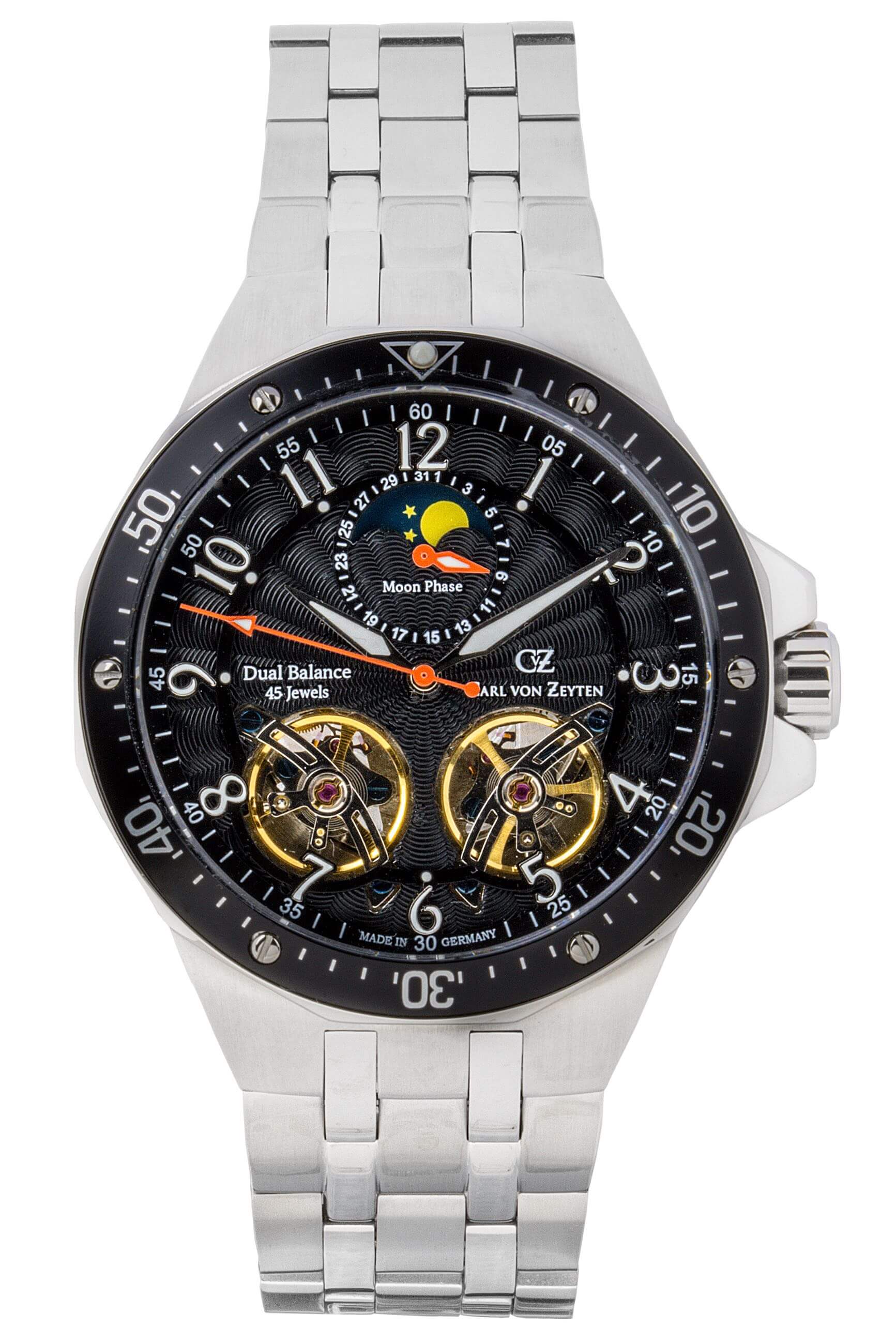 Carl von Zeyten -Kirchzarten Herrenuhr Silber Schwarz Mondphase Saphirglas Automatik 46mm- CVZ0093BKMSCarl von Zeyten -Kirchzarten Herrenuhr Silber Schwarz Mondphase Saphirglas Automatik 46mm- CVZ0093BKMS