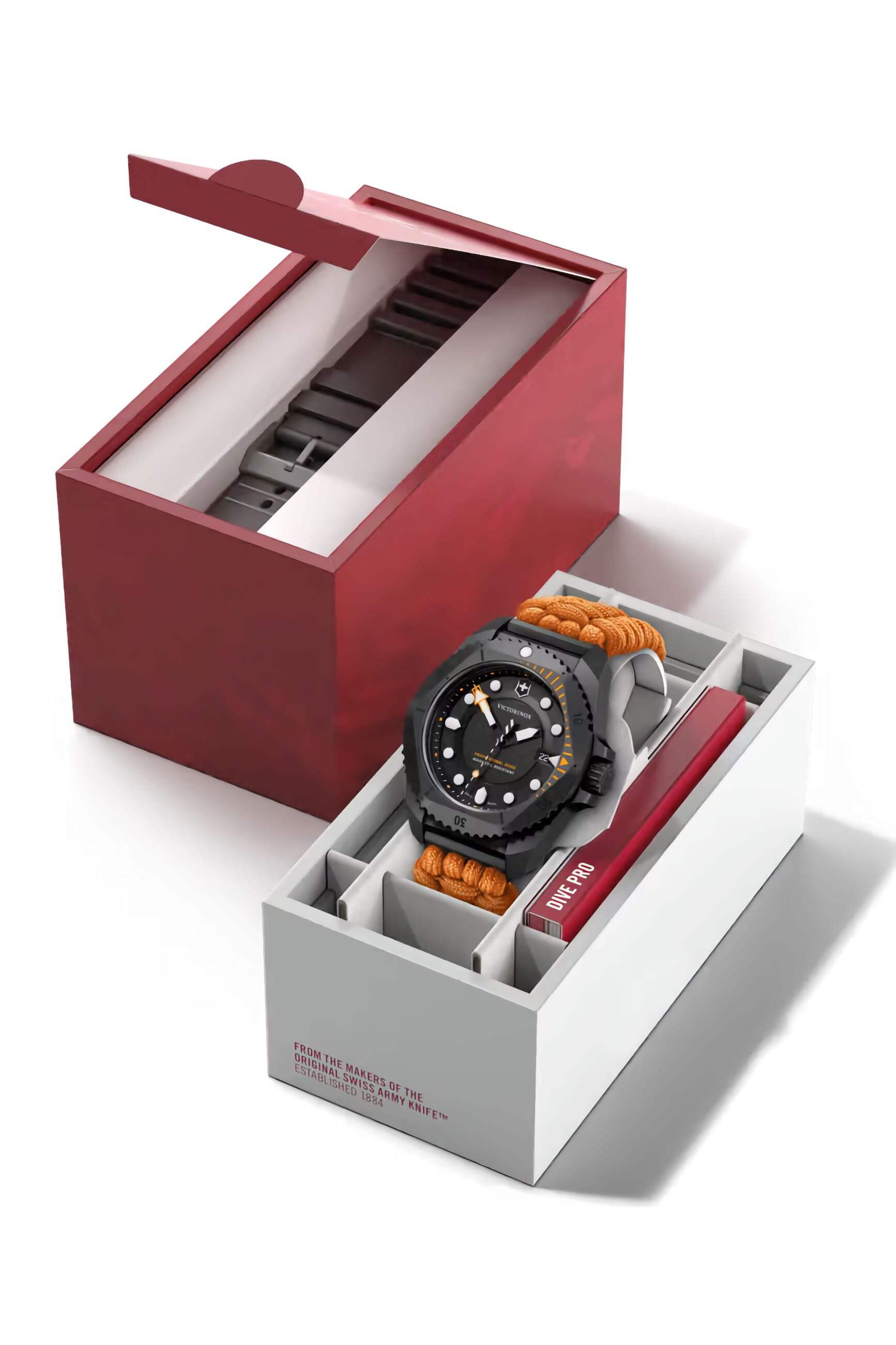 Strapazierfähig, robust und innovativ – mit schwarzem 43-mm-Titangehäuse, orangefarbenem Survival Paracord-Armband und lumineszierenden Indexen, Minuten- und Stundenzeigern ist diese Dive Pro Quartz bestens auf alles vorbereitet. Die professionelle Taucheruhr mit Schweizer Ronda-715-Quarz