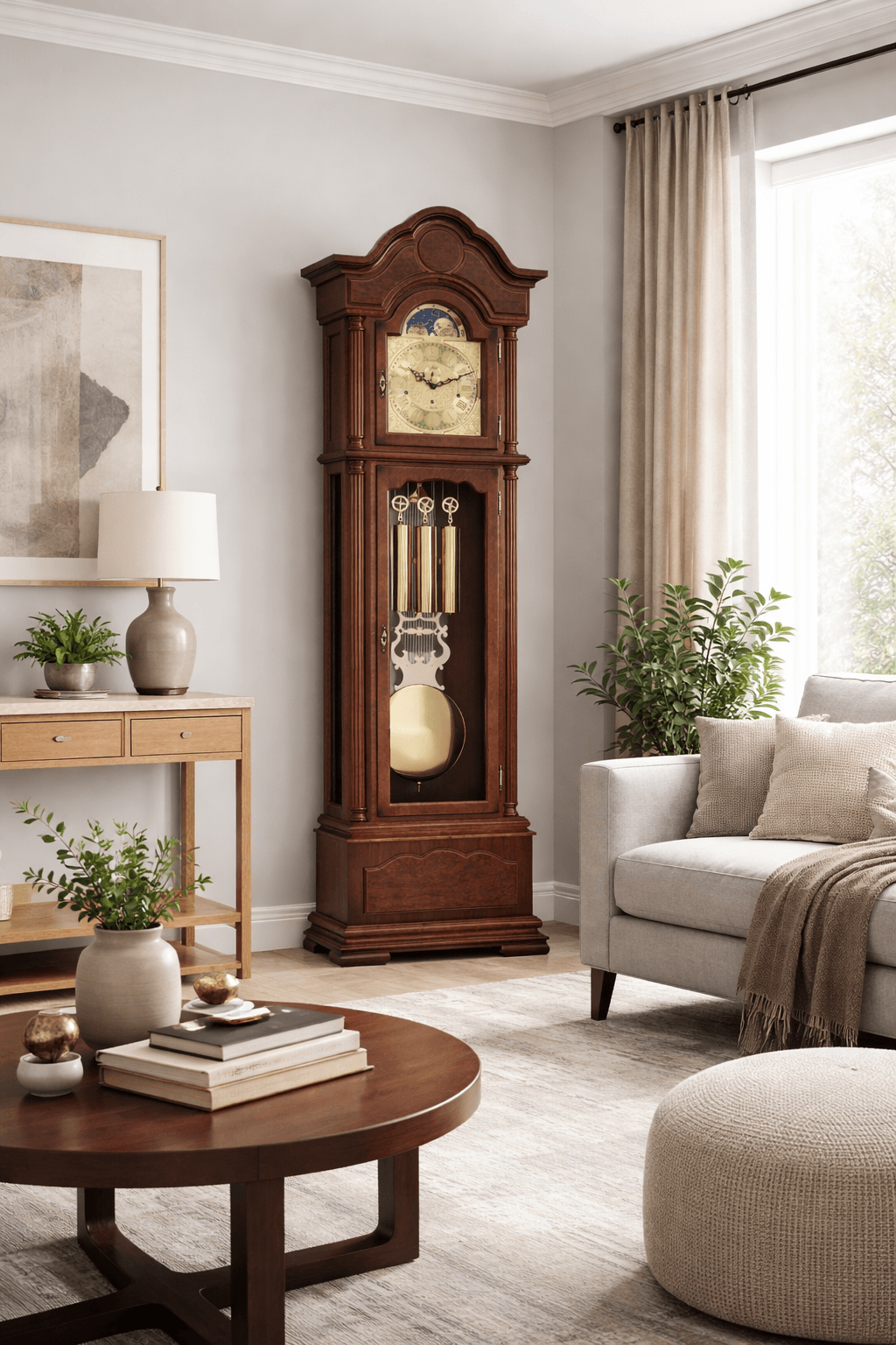 Klassische Standuhr mit Massivholzgehäuse. Für Nussbaum verwenden wir massives Ahorn- oder Erlenholz, das in mehreren Arbeitsgängen gebeizt und lackiert wird, um die feinen Originaltöne der jeweiligen Holzfarbe zu erzielen.